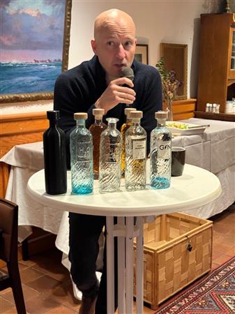 Man gör inte bara gin, även annat som Espresso Martini och glögg och Vinterspritz. Alla flaskor är numrerade, gjordes för hand till i somras, nu maskinellt. Önskemål om en gemensam provsmakning framfördes till programkommittén.